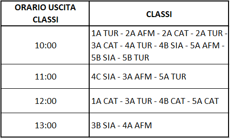 Si comunica che il Venerdì 1 Dicembre 2023, per adesione all’assemblea sindacale dei docenti, le classi di seguito indicate usciranno anticipatamente come indicato: