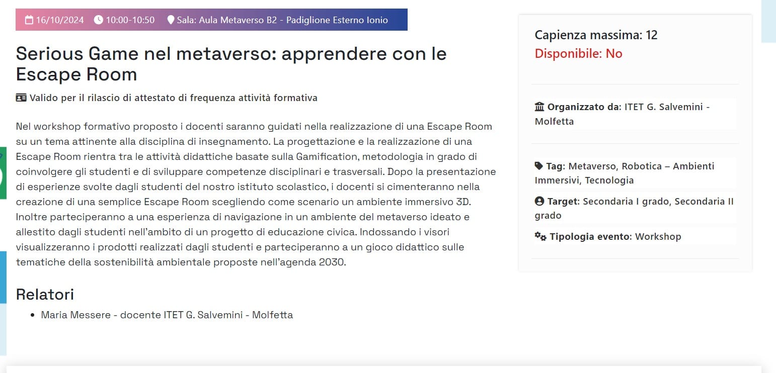 Tema: Gamification con il focus su “Serious Game nel metaverso: apprendere con le Escape Room”.